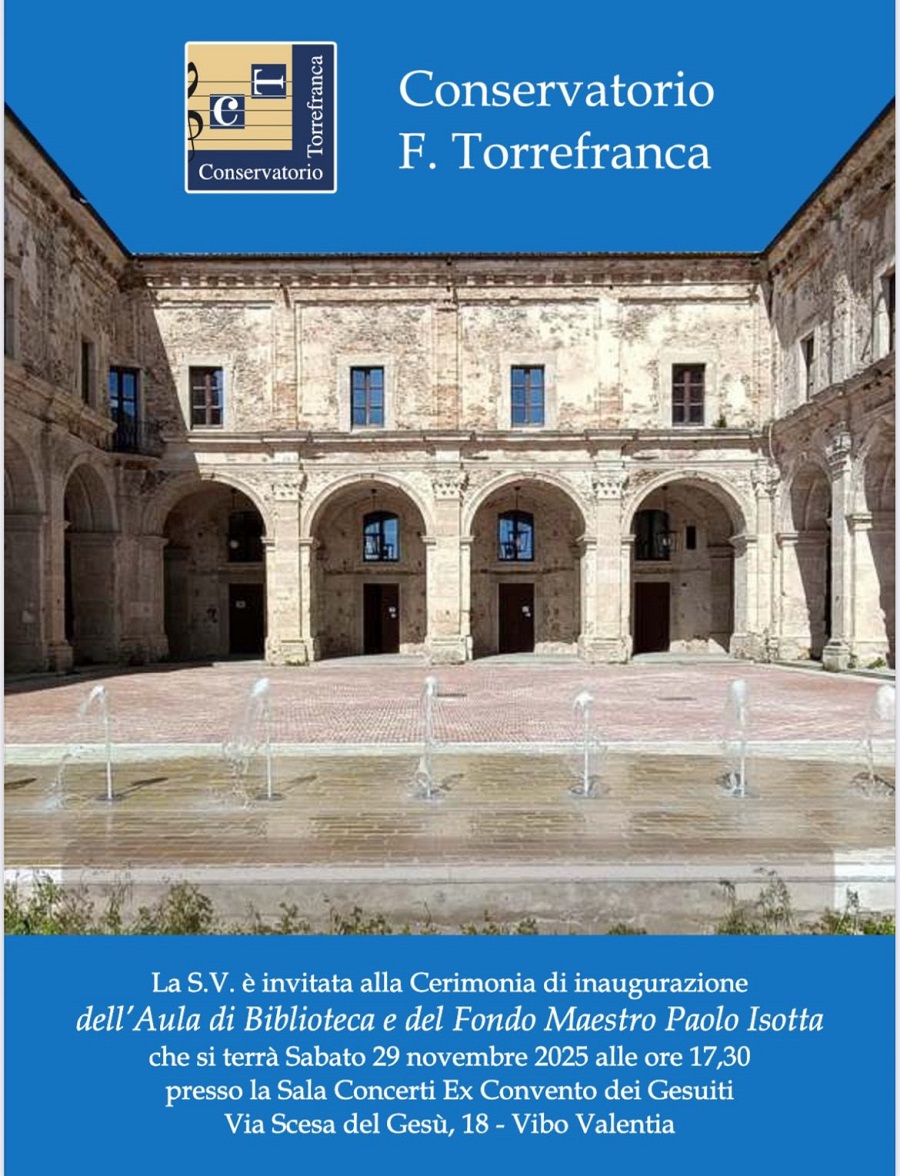 Il Conservatorio “Fausto Torrefranca” inaugura il Fondo bibliografico-musicale appartenuto a Paolo Isotta e l’Aula della Biblioteca a lui intitolata. Il nuovo Fondo comprende edizioni critiche internazionali di pregio, partiture sinfoniche, teatrali, cameristiche e sacre, riduzioni canto-pianoforte, partiture tascabili e un ricchissimo repertorio di materiali analitici — testimonianza viva del metodo e del pensiero critico di Isotta.